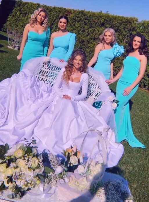Interpretul de muzică populară a optat pentru un costum negru, cămașă albă și papion, în timp ce mireasa a strălucit într-o rochie de prințesă, cu mâneci lungi, în ton cu vremea de toamnă. Domnișoarele de onoare au purtat toate aceeași ținută.