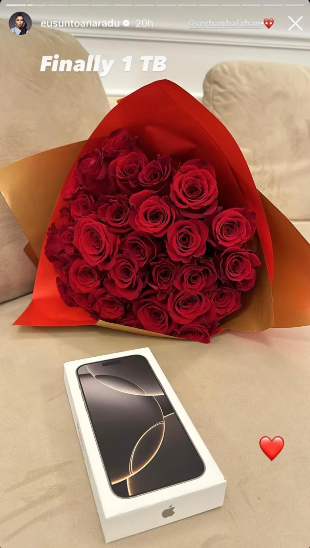 Șerban Balaban i-a oferit Oanei Radu un buchet imens de trandafiri roșii și un telefon, ultimul model, care nu este deloc ieftin. Foarte încântată, artista a postat o imagine pe rețelele sociale cu darul primit de la noul ei iubit.