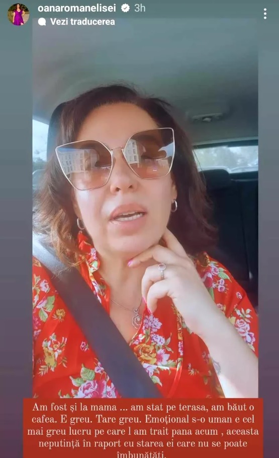 “Am fost la mama, am stat cu ea pe terasă, am băut o cafea. Cel mai greu lucru pe care mi-a fost dat să-l trăiesc realmente emoțional și uman în viața asta până acum este această neputință pe care o simt în raport cu situația ei, care nu se poate îmbunătăți cu nimic, medical vorbind. Asta e cel mai greu, dar asta e viața! Din păcate, nu avem ce face”, este mesajul transmis de Oana Roman, pe pagina sa de Instagram.