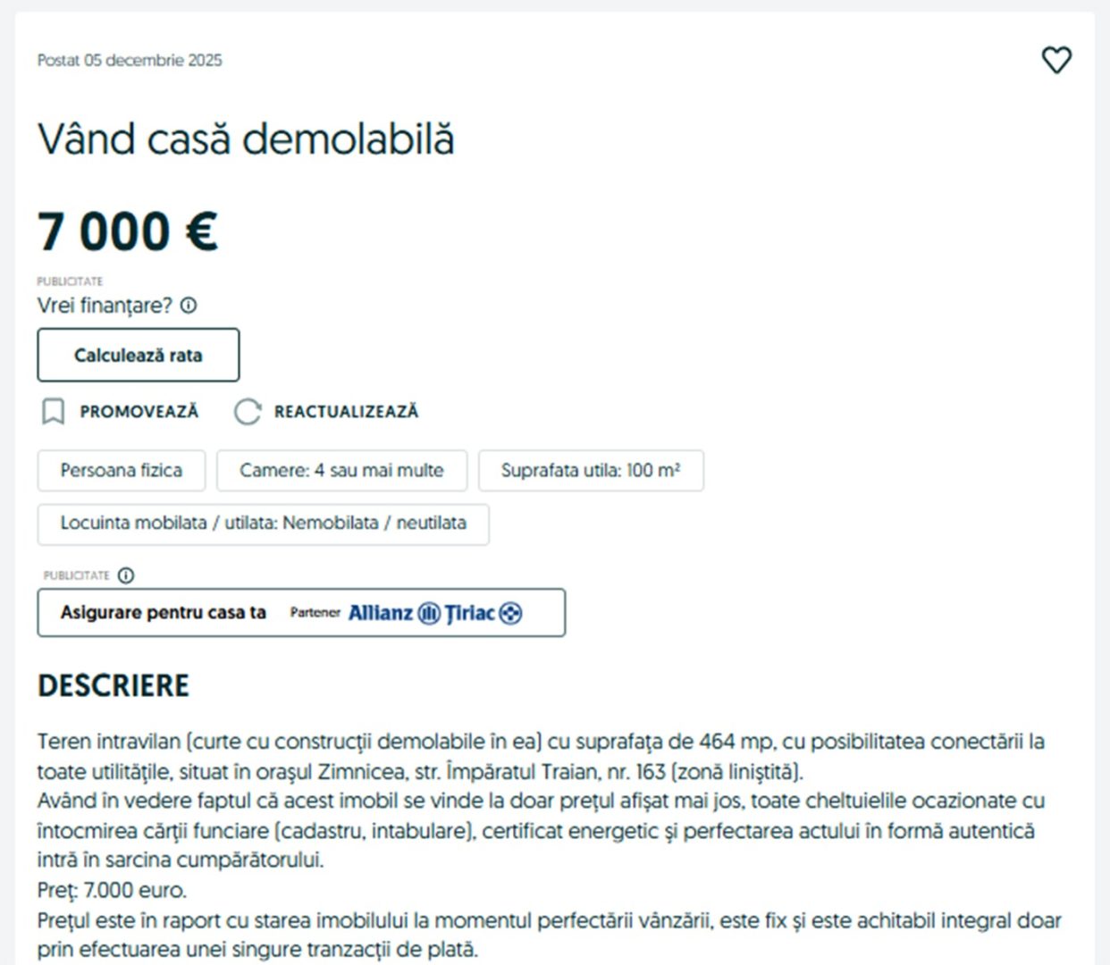 Oferta include un teren intravilan cu o suprafață de 464 mp, pe care se află construcții demolabile. Prețul de 7.000 de euro este fix și se achită integral printr-o singură tranzacție. Toate cheltuielile legate de întocmirea cărții funciare (cadastru, intabulare), obținerea certificatului energetic și perfectarea actului în formă autentică revin în sarcina cumpărătorului, se precizează în anunț.