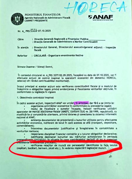 „Inspecția fiscală are temă de control pe HoReCa și li se cere inspectorilor să ia înregistrările de la camerele video, ceea ce este un abuz. Se cere și verificarea contractelor de muncă, ceea ce iar este un abuz, pentru că se ocupă ITM de acest lucru. Nu e treaba inspecției fiscale. Avem un management absolut neprofesionist. În loc să ne ocupăm de marea evaziune fiscală, se reintroduce un indicator de performanță care ridică ratingul personal și este un abuz. Șefii incită la abuz, printr-un astfel de indicator”, a transmis Dorin Modure, președintele Federației „Solidaritatea”, pentru Jurnalul.