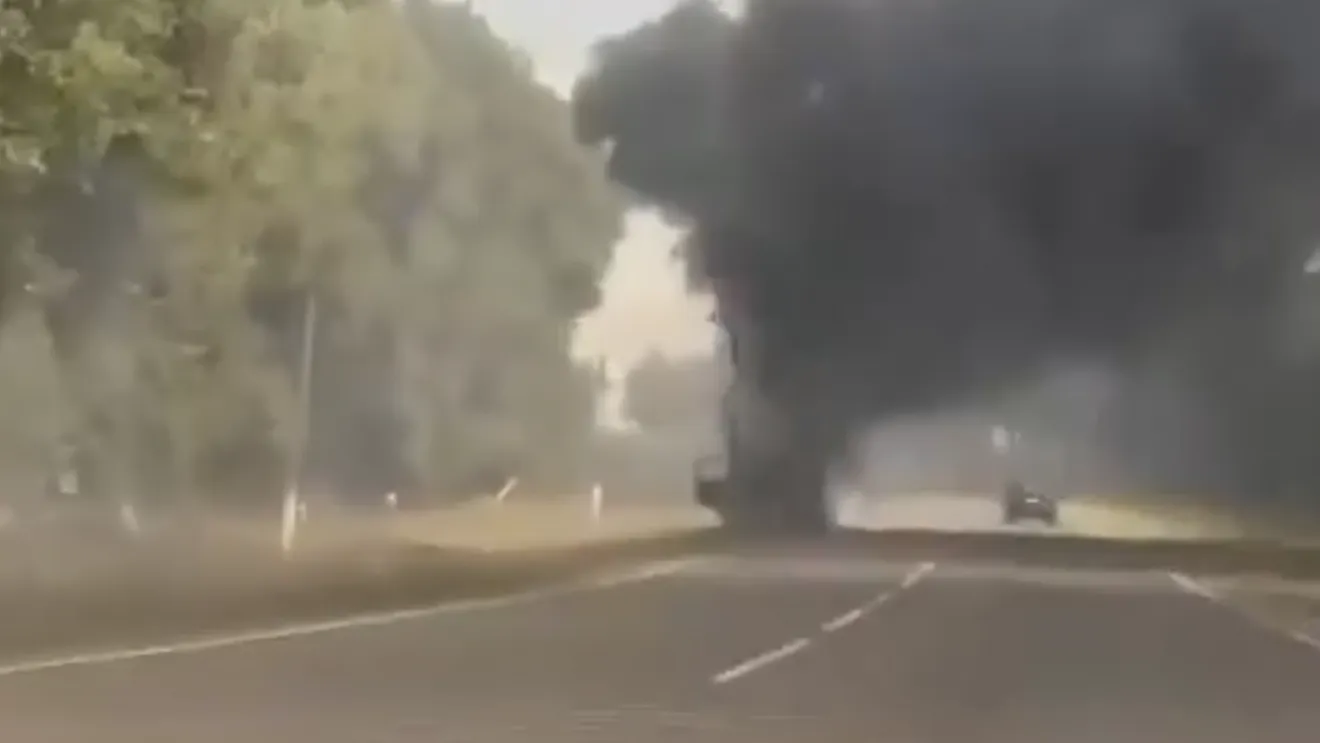 Mesajul este însoţit de o fotografie ce arată un autobuz cu geamuri sparte, ieşit de pe şosea, în faţa căruia se află trupuri blurate.
