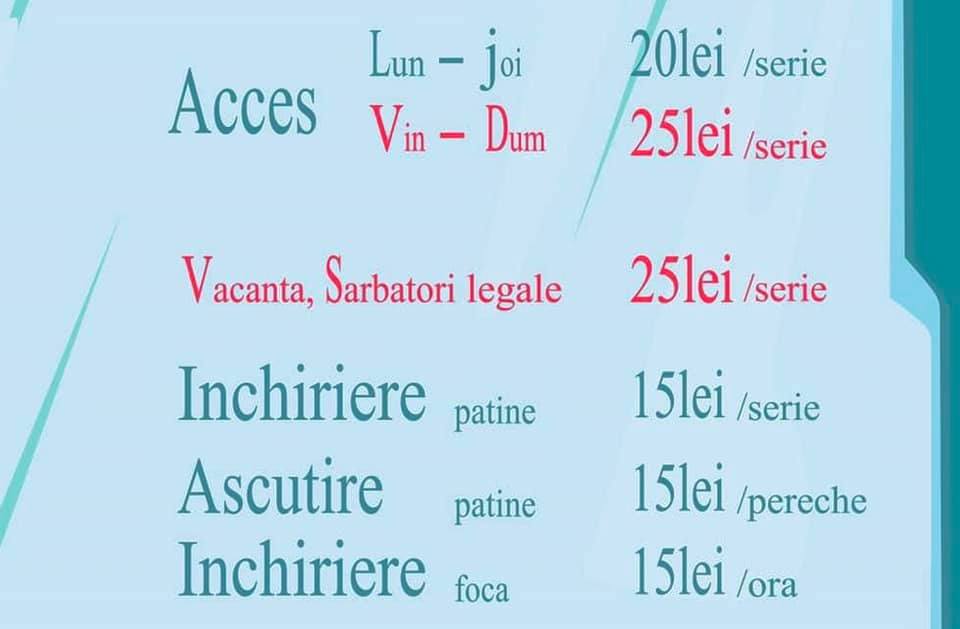 O oră de distracție pe patine costa 10 lei, însă doar de luni până vineri, fiindcă în weekend, tariful va crește la 25 de lei. Cei care nu au patine le vor putea închiria cu 15 lei de la fața locului.