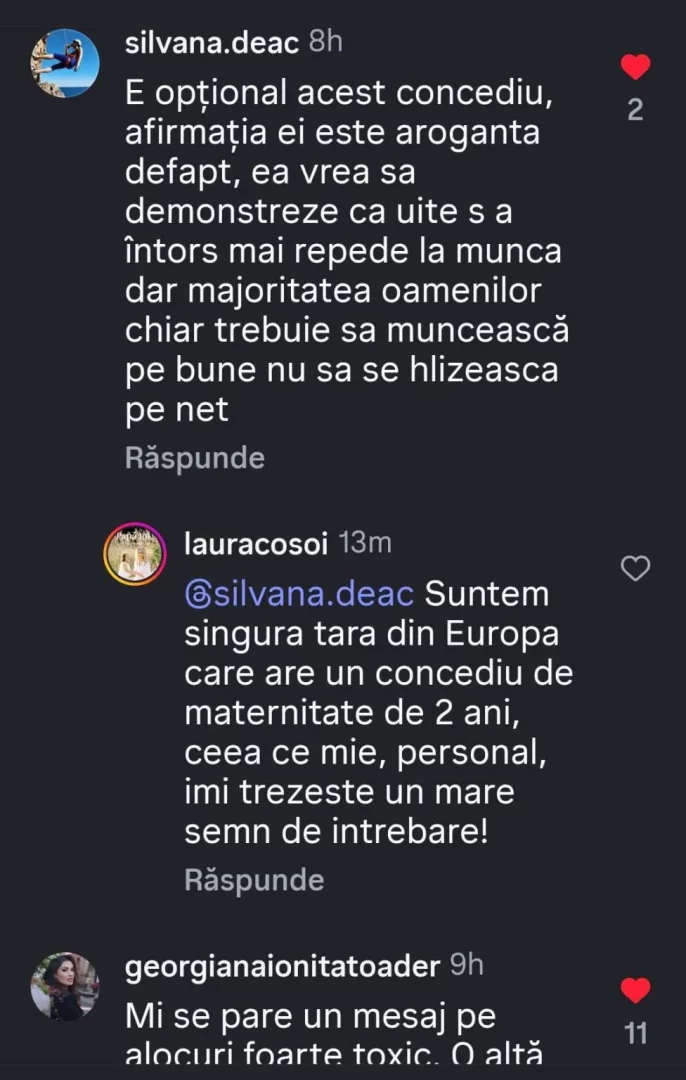 „Suntem singura țară din Europa care are un concediu de maternitate de doi ani, ceea ce mie personal îmi trezește un mare semn de întrebare!”, a fost replica Laurei Cosoi din comentarii.
