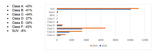 În luna februarie 2026, faţă de aceeaşi lună a anului trecut, observăm o evoluţie mixtă a segmentelor în care sunt încadrate autoturismele, după cum urmează: