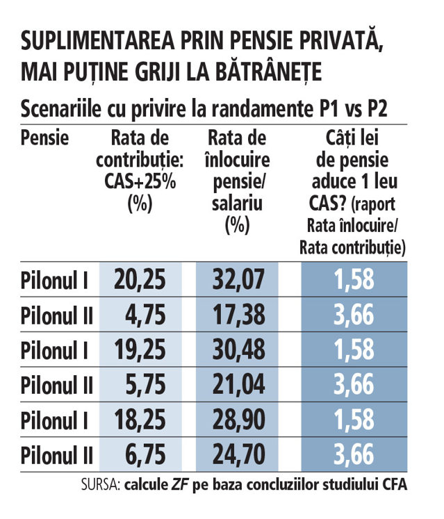 Studiul CFA analizează trei scenarii cu diferite rate de contribuţie la Pilonul 2 (4,75%, 5,75%, 6,75%) versus Pilonul 1, pentru un tânăr cu salariul mediu care contribuie 35 de ani (2025-2059) şi va primi pensie timp de 16 ani şi 3 luni, longevitatea la pensie estimată în condiţiile demografice de azi. în toate cele trei scenarii, rata de înlocuire (pensia raportată la ultimul salariu) obţinută de Pilonul II, raportată la rata de contribuţie, este de 2,31 ori mai mare decât acelaşi raport pentru Pilonul I de stat. Analiza CFA ia în considerare un randament mediu anual de 6% pentru Pilonul II (sub cel de 7,7% anual obţinut până acum, timp de aproape 17 ani), o inflaţie medie anuală de 3% şi consideră restul condiţiilor, inclusiv indexarea pensiilor de stat, în concordanţă cu legislaţia de astăzi.