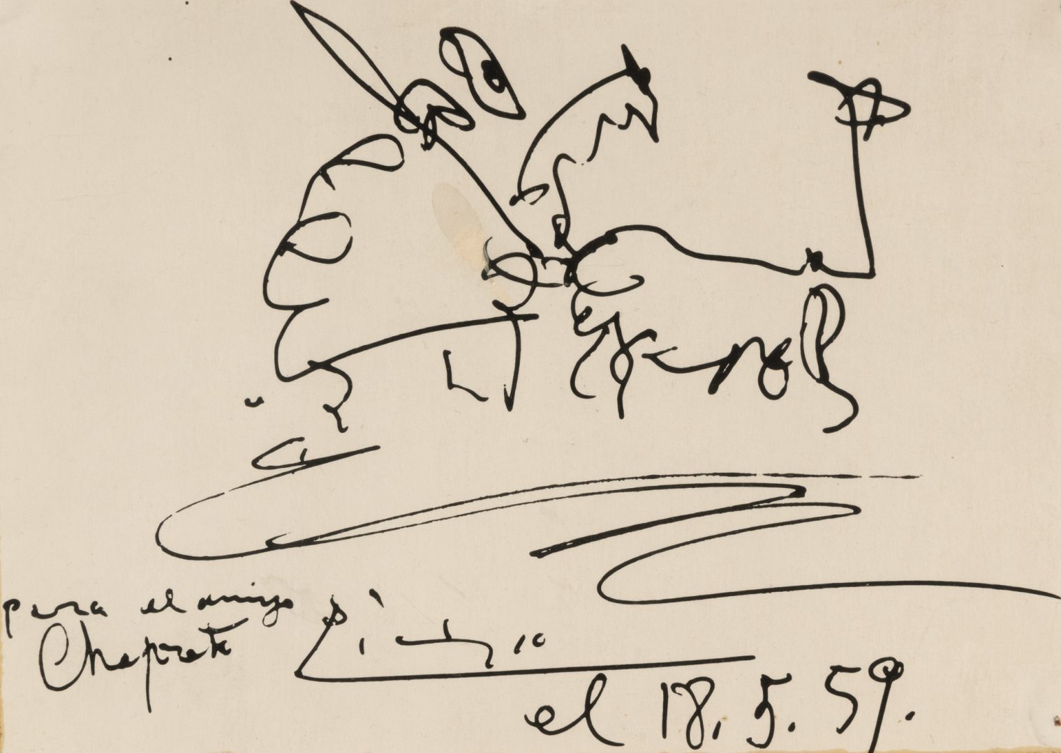 Printre piesele scoase la licitație se numără un desen semnat de Pablo Picasso, intitulat „Scenă de coridă” (1959), realizat în tuș pe hârtie, semnat, datat și dedicat „para el amigo Chaprate” („pentru prietenul meu Chaprate”). Lucrarea are un preț de pornire de 8.000 de euro.