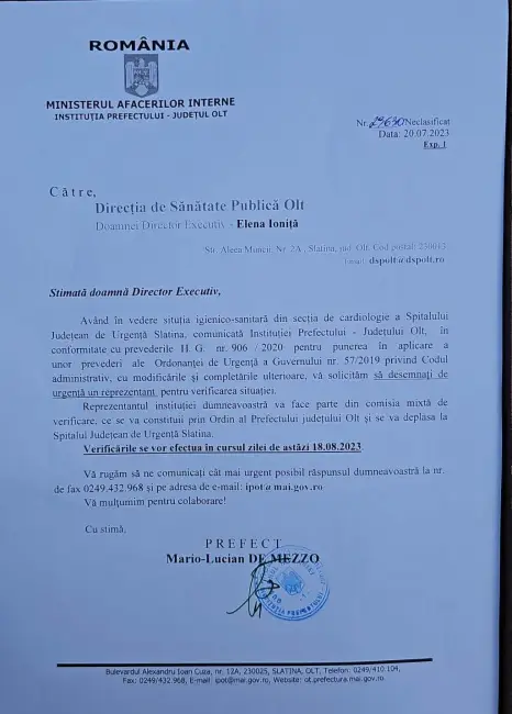 Mario De Mezzo este prefect al județului Olt din 3 august. Atunci a fost numit în ședința de Guvern, iar în data de 4 august a depus jurământul. Vineri, 18 august, el a transmis o adresă către Direcţia de Sănătate Publică (DSP) Olt, care era datată cu ziua de 20.07.2023.