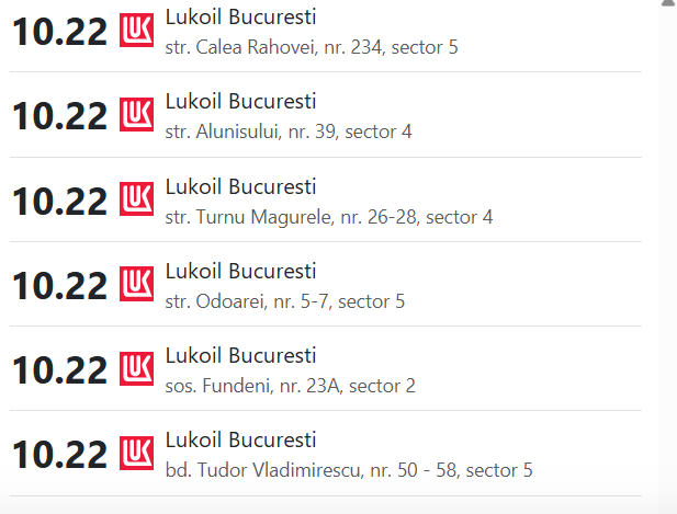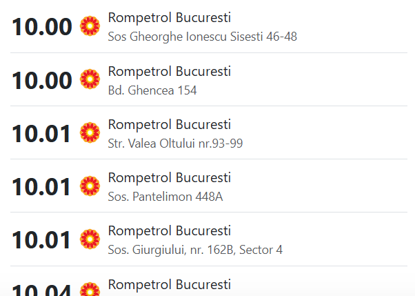 Cele mai ridicate tarife sunt înregistrate în rețeaua Lukoil, unde motorina a ajuns la 10,21–10,22 lei/litru în unele stații. Și Rompetrol a trecut pragul de 10 lei în mai multe puncte de alimentare: prețurile variază de la 9,96 lei într-o singură stație, până la un maxim de 10,04 lei/litru. Distribuția este eterogenă: 9,97 lei în trei stații, 9,98 lei în două, 9,99 lei în alte două, iar în trei stații prețul este exact 10 lei.