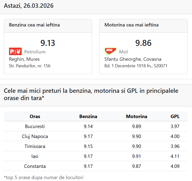 Preţ carburanţi 26 martie 2026, evoluţie în timp real AICI