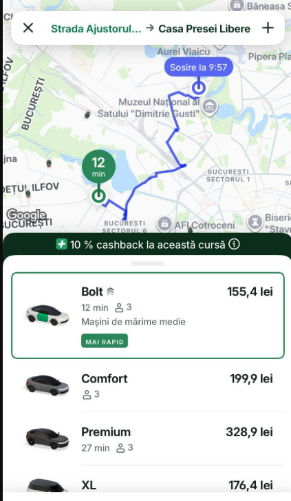 O captură din aplicația Bolt arată că pentru o cursă de aproximativ 30 de minute, în București, de pe strada Ajustorului până la Casa Presei, prețul a ajuns la 155,4 lei pentru categoria standard. Pentru varianta Comfort, tariful urcă la 199,9 lei, iar Premium depășește suma de 328 de lei.