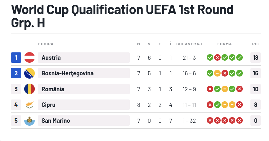 Austria este lider în clasament, cu 15 puncte, cu două mai multe decât Bosnia – locul 2. România ocupă poziţia a treia, cu 10 puncte, Cipru este pe 4, cu 8 puncte, iar San Marino este pe 5, fără puncte. În aceeași grupă va avea loc sâmbătă meciul Cipru – Austria, arbitrat de elveţianul Urs Schnyder.