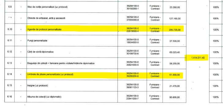 Lista obiectelor de protocol este una șocantă: suport personalizat pentru telefon (peste 30.000 lei), obiecte de artizanat (peste 120.000 lei), agende personalizate (peste 200.000 lei), pungi personalizate (peste 25.000 lei) sau cărți de vizită diplomatice (peste 63.000 lei). De asemenea, Primăria Capitalei vrea să cheltuie peste 100.000 lei pe tot felul de produse de „promovare turistică”, adică pixuri, etichete bagaj, USB-uri sau plase de pânză).
