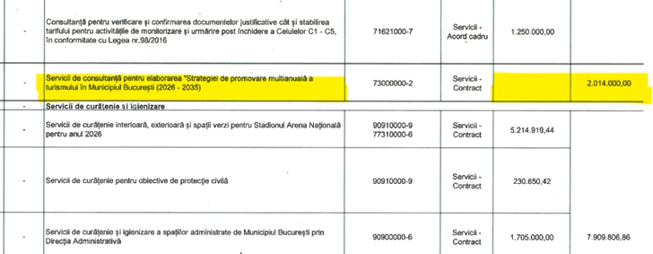 Tot în contextul achizițiilor de protocol și promovare, merită menționat și faptul că Primăria a bugetat alte două milioane de lei pentru servicii de consultanță cu privire la elaborarea unei strategii pentru următorii zece ani de promovare turistică a Capitalei.