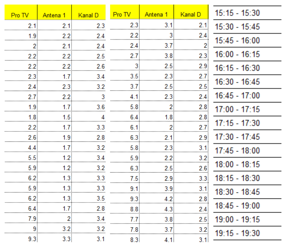 În intervalul 15.00–16.00, Antena 1 s-a poziționat pe primul loc, cu o cotă de piață de 20,6%, dominând clar segmentul. Pro TV, cu difuzarea serialului „Leyla”, a înregistrat un share de 15%, în timp ce Kanal D, care difuzează emisiunea lui Dan Negru în acest interval, s-a clasat foarte aproape, cu 14,6%. Diferențele relativ mici dintre locurile doi și trei indică o competiție strânsă pentru publicul activ, dar și o fragmentare accentuată a audienței în acest interval.