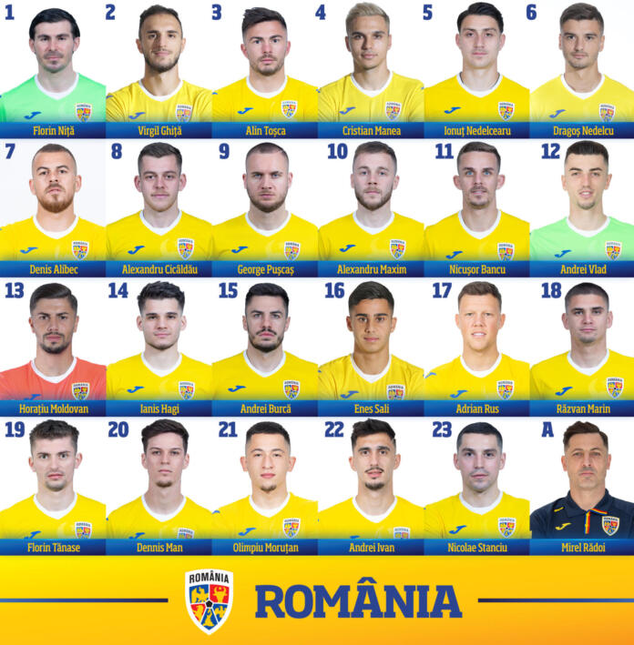 MIJLOCAŞI: Dragoş Nedelcu (Fortuna Düsseldorf | Germania, 5/0), Răzvan Marin (Cagliari | Italia, 35/2), Alexandru Cicâldău (Galatasaray | Turcia, 18/2), Nicolae Stanciu (Slavia Praga | Cehia, 52/11), Olimpiu Moruţan (Galatasaray | Turcia, 1/0), Ianis Hagi (Rangers | Scoţia, 22/2), Florin Tănase (FCSB, 9/1), Dennis Man (Parma | Italia, 12/2), Alexandru Maxim (Gaziantep F.K. | Turcia, 49/6), Enes Sali (Farul Constanţa, 0/0)