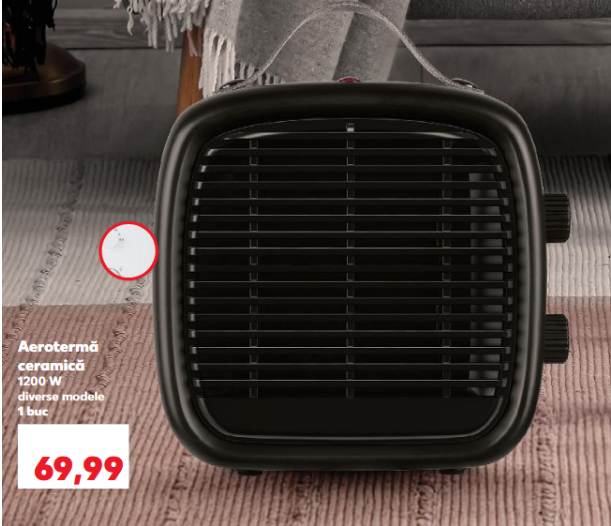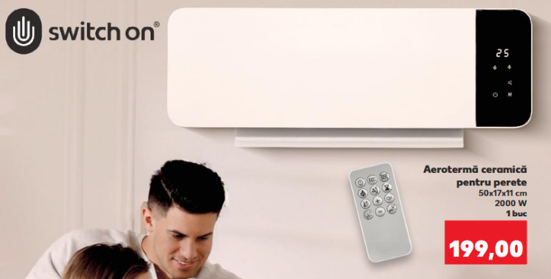 Kaufland are în oferta sa o aerotermă ceramică Switch On. Produsul are 1.200 W și are diverse modele și costă doar 69,99 lei.