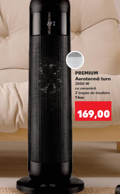 Produsul este la prețul de 169,00 lei/1 bucată, are 2000 W și are două trepte de încălzire.