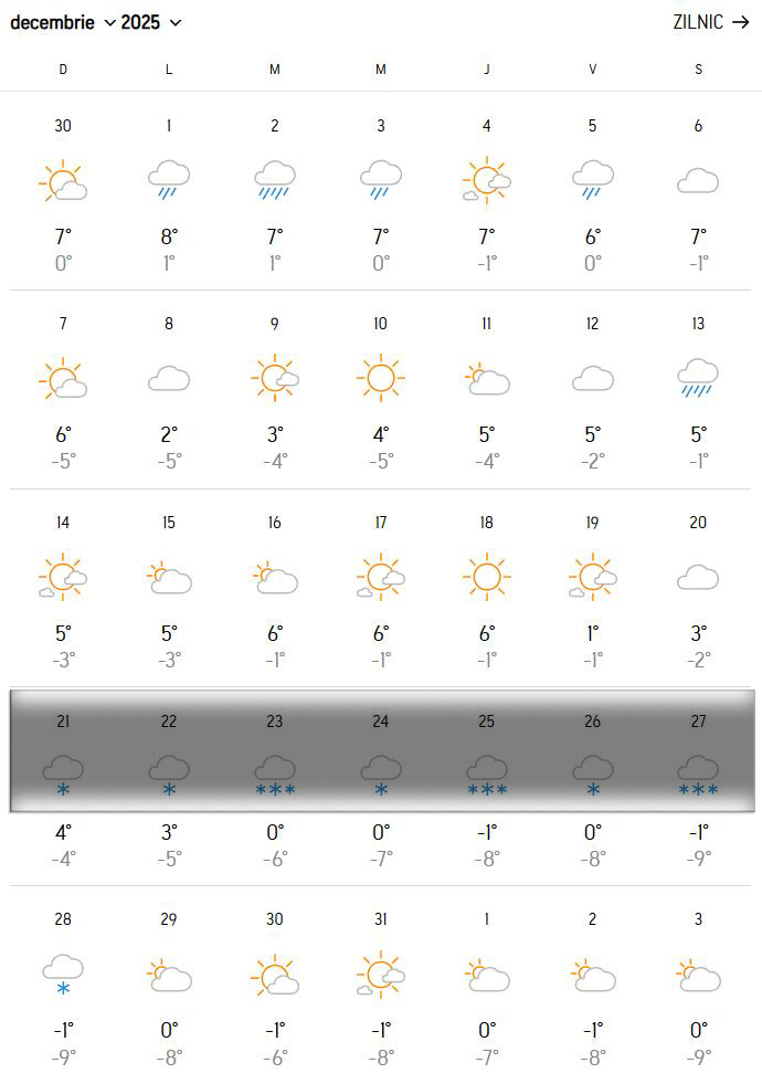 Prognoza ACCUWEATHER actualizată. Orașele din România în care ninge șapte zile la rând. Meteorologii Accuweather anunță că, în București, iarna va debuta cu o ploaie înghețată, în data de 23 decembrie, cu temperaturi de max. 3 grade Celsius și min. -4 grade. În București va ninge în preajma Crăciunului, în zilele de 25, 26, 27 și 28 decembrie.