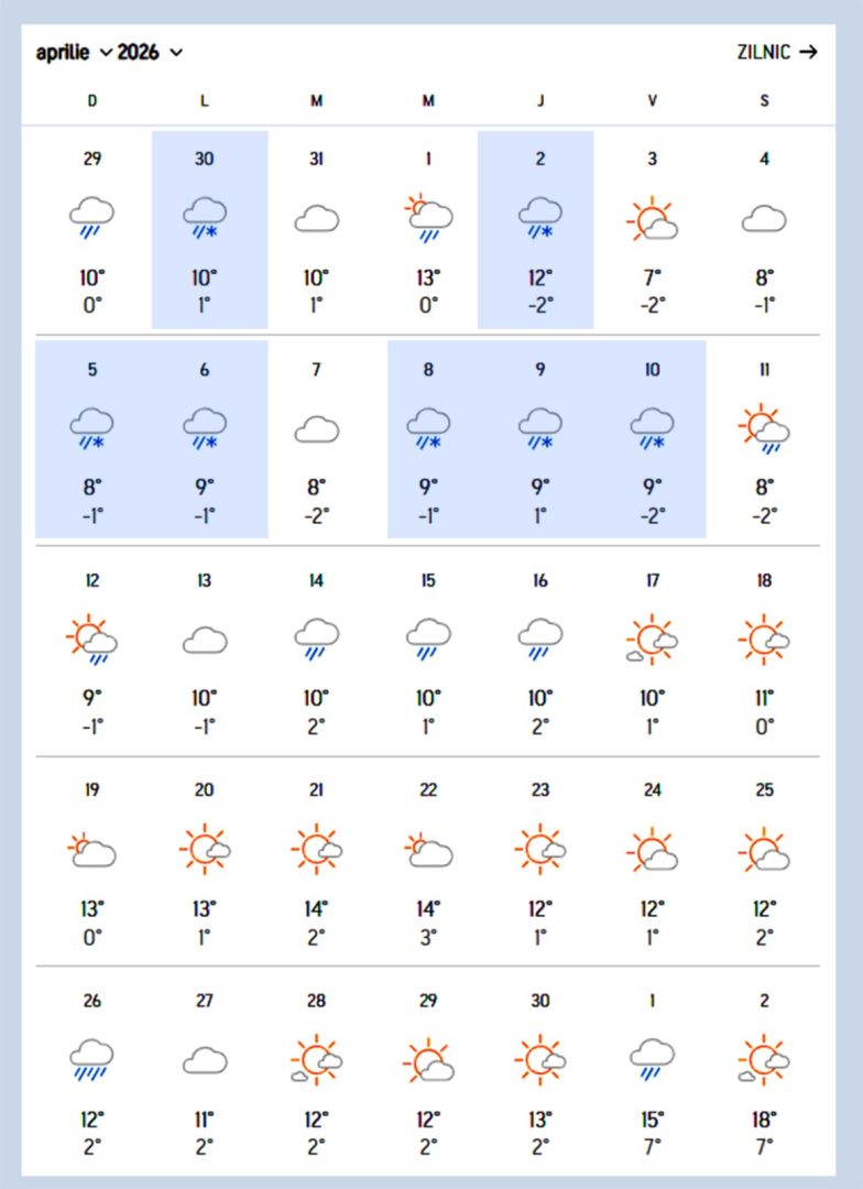 Spre finalul lunii, valorile termice ajung chiar la 18–20 de grade, iar zilele însorite devin predominante.