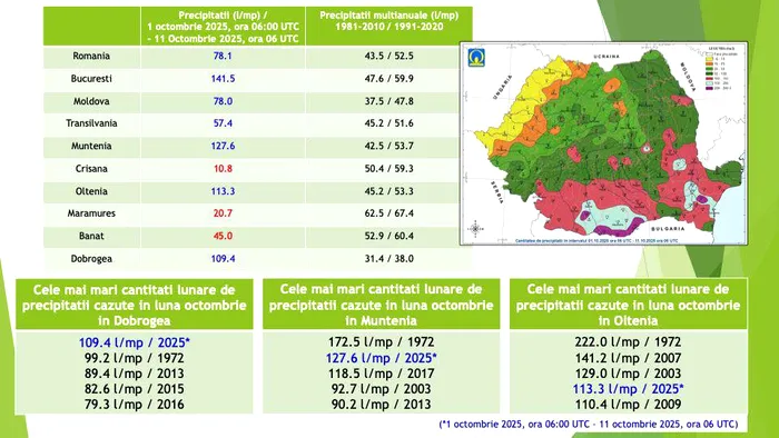 Hărțile publicate de ANM arată o anomalie pluviometrică fără precedent în ultimii 50 de ani. Media precipitațiilor la nivel național între 1 și 11 octombrie a fost de 78,1 l/mp, față de o medie multianuală (1991–2020) de doar 52,5 l/mp pentru întreaga lună.