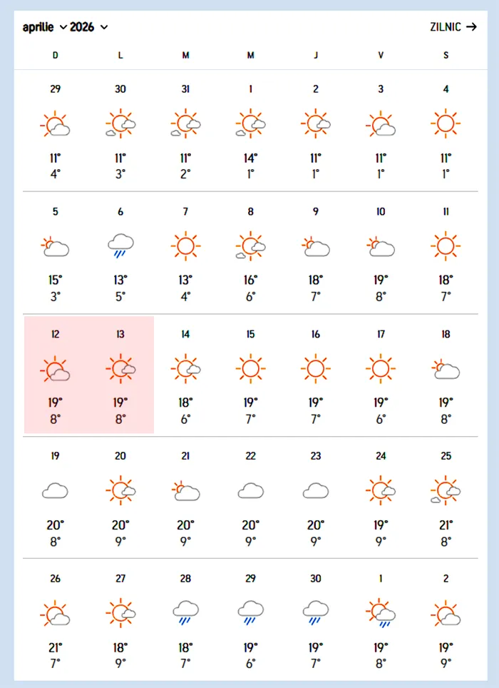 Conform estimărilor, duminică, 12 aprilie 2026, temperaturile maxime vor ajunge la aproximativ 19 grade Celsius, în timp ce minima nopții va fi în jur de 8 grade Celsius. Cerul va fi variabil, cu perioade însorite, ceea ce va crea condiții bune pentru plimbări, vizite la familie sau activități în aer liber.