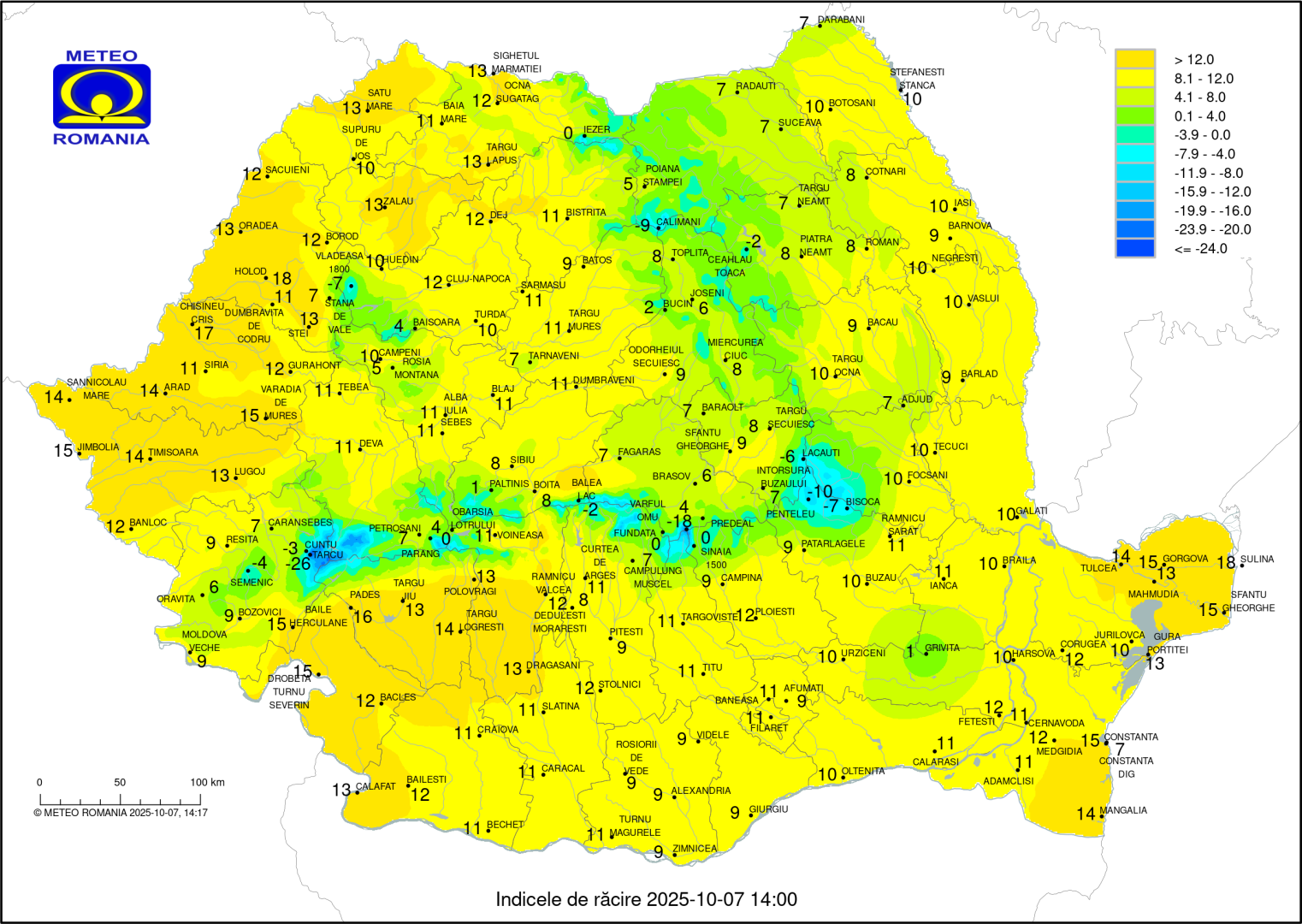 Harta indicelui de răcire, temperaturi resimţite de MINUS 20 de grade la munte din cauza vântului
