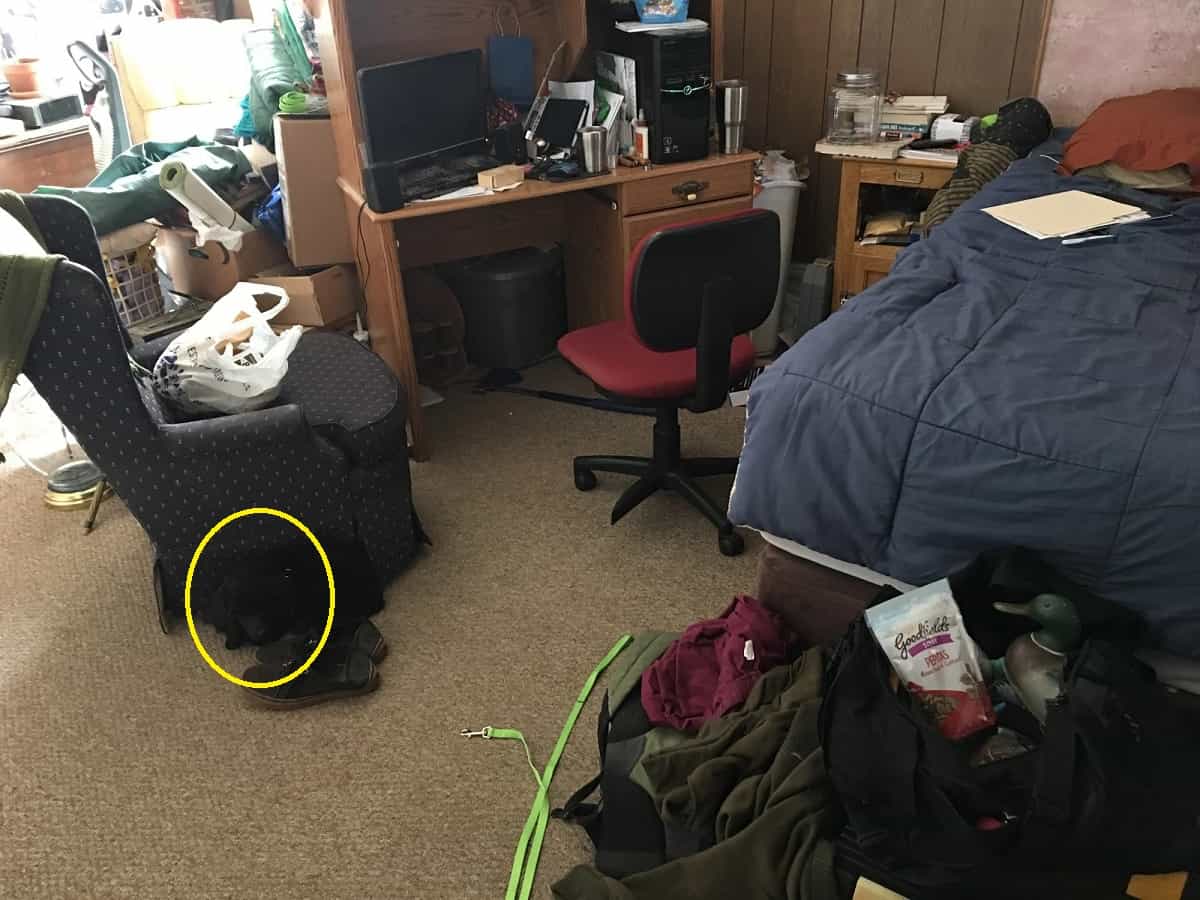 În fotografie observați o cameră dezordonată. Un computer, un pat și mai multe haine aruncate pe jos pot fi zărite în imagine. Undeva în poză există și un câine, iar provocarea cea mare este să-l găsiți în șase secunde.