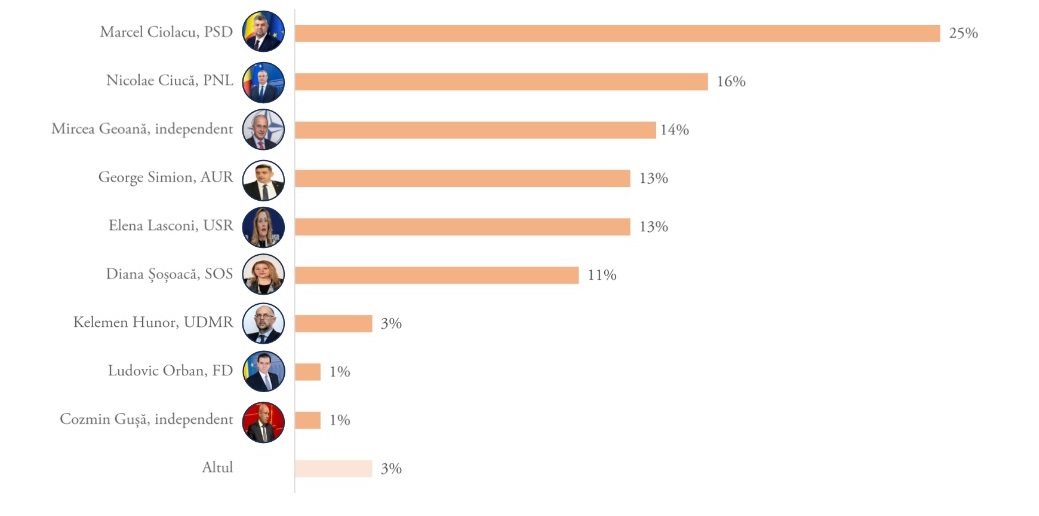 Pe primul loc în acest sondaj pentru alegerile prezidențiale se află Marcel Ciolacu, cu 25%, fiind urmat de Nicolae Ciucă (16%) și Mircea Geoană (14%).