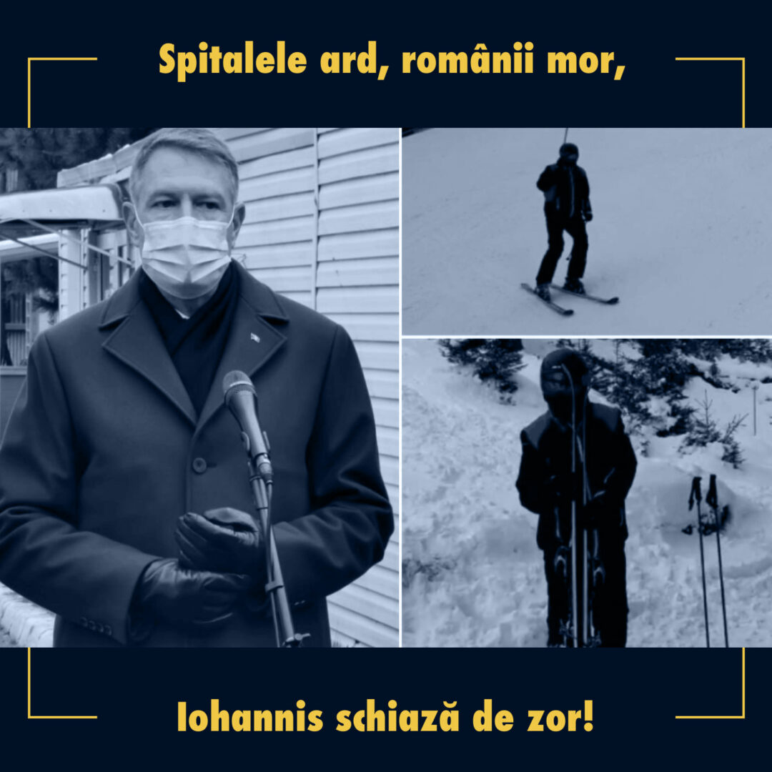 În rest, Klaus Iohannis este perfect paralel cu viața semenilor săi precum schiurile sale ultimul răcnet, în timpul ultimei coborâri, la Păltiniș!”, au transmis reprezentanții PSD, atașând și o fotografie cu Klaus Iohannis cu textul „Spitalele ard, românii mor, Iohannis schiază de zor!”.