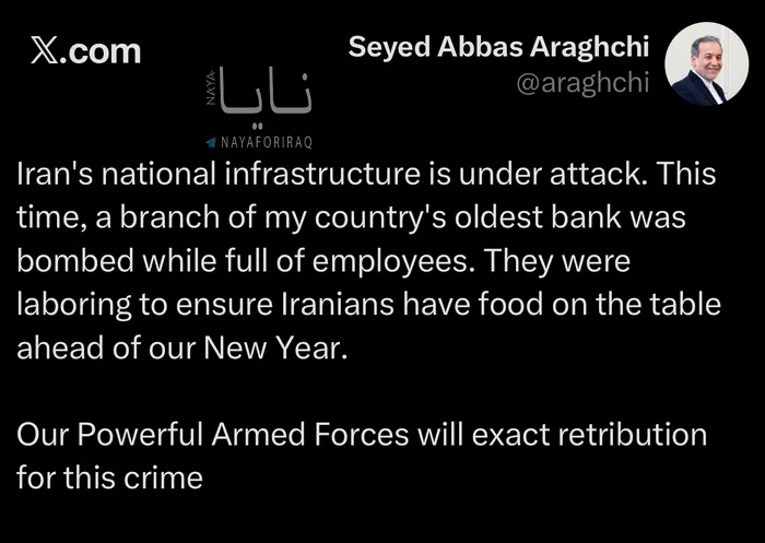 Într-o postare publicată pe X, ministrul de Externe iranian, Seyed Abbas Araghchi, susține că a fost atacată o bancă, în timp ce era plină cu angajați.