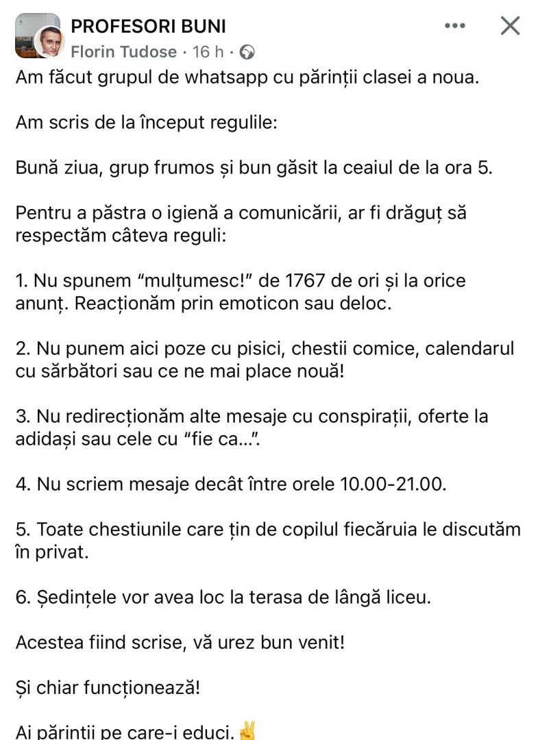 Ai părinții pe care-i educi.”, a scris profesorul pe grupul de Whats App și ulterior pe Facebook.
