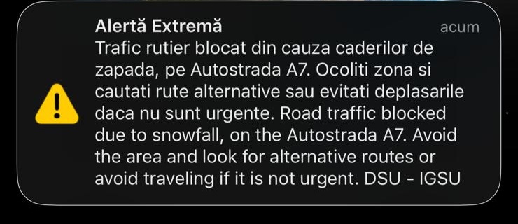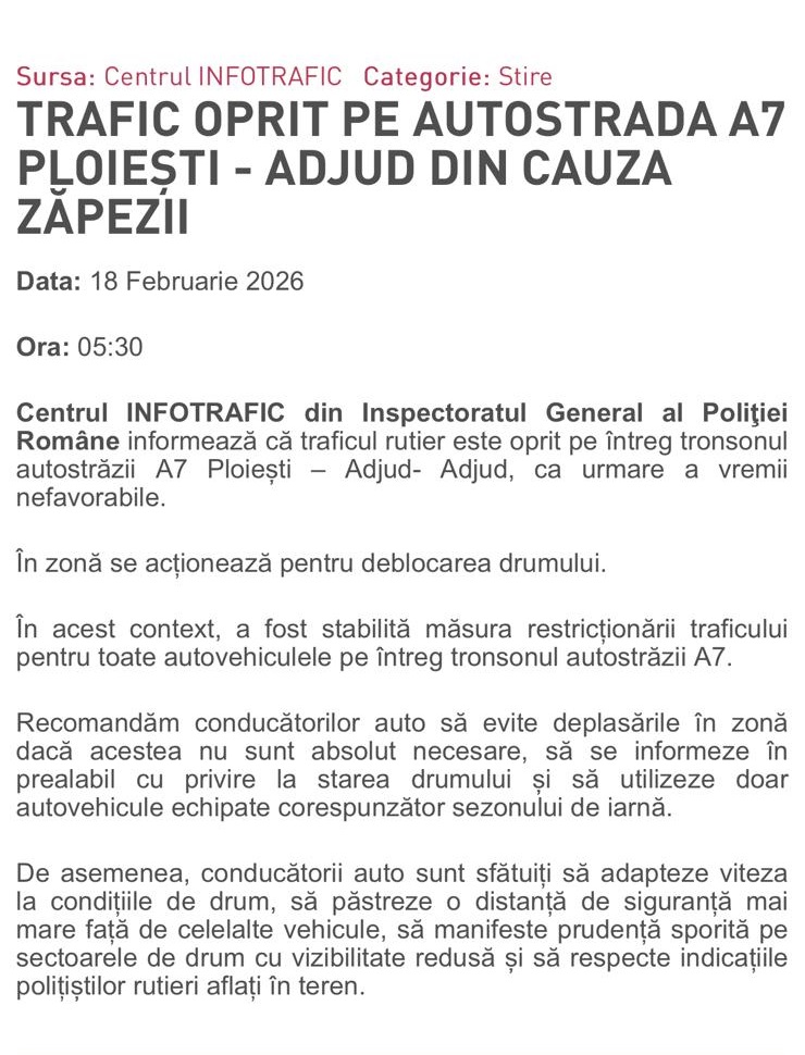 „Centrul INFOTRAFIC din Inspectoratul General al Poliţiei Române informează că traficul rutier este oprit pe întreg tronsonul autostrăzii A7 Ploiești – Adjud- Adjud, ca urmare a vremii nefavorabile. În zonă se acționează pentru deblocarea drumului.
