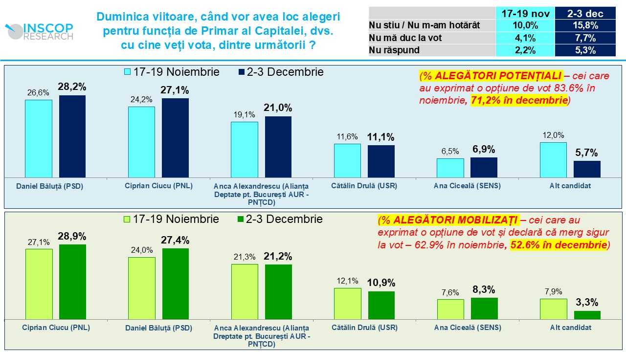 Dintre cei care merg sigur la vot (adică 52.6% din total eșantion), 28.9% l-ar vota pe Ciprian Ciucu (PNL) ca Primar General al Municipiului București (față de 27.1% în noiembrie), 27.4% pe Daniel Băluță (PSD) (față de 24% în noiembrie), iar 21.2% pe Anca Alexandrescu (independentă, susținută de AUR și PNȚCD) (față de 21.3% în noiembrie). 10.9% dintre bucureșteni l-ar alege pe Cătălin Drulă (USR) (față de 12.1% în noiembrie), iar 8.3% pe Ana Ciceală (SENS) (față de 7.6% în noiembrie). 3.3% indică un alt candidat (față de 7.9% în noiembrie).