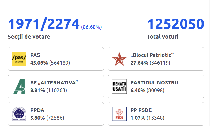 REZULTATE ALEGERI MOLDOVA 2025, după 86,68% din secţii, dintre care peste 25% din Diaspora: