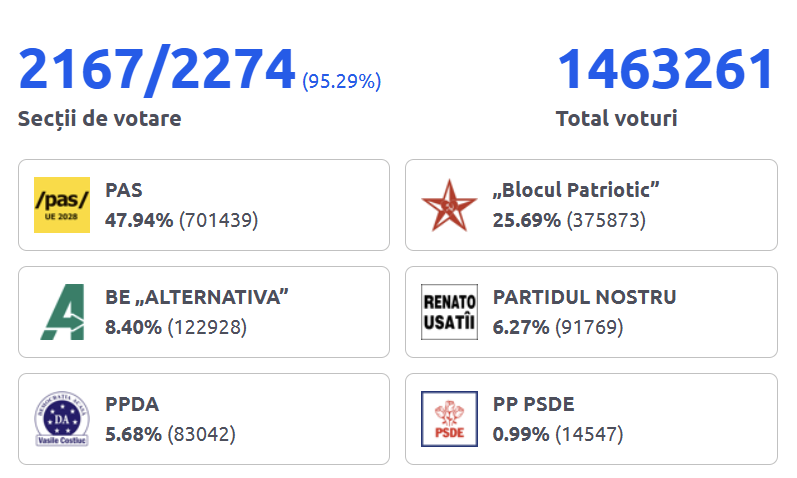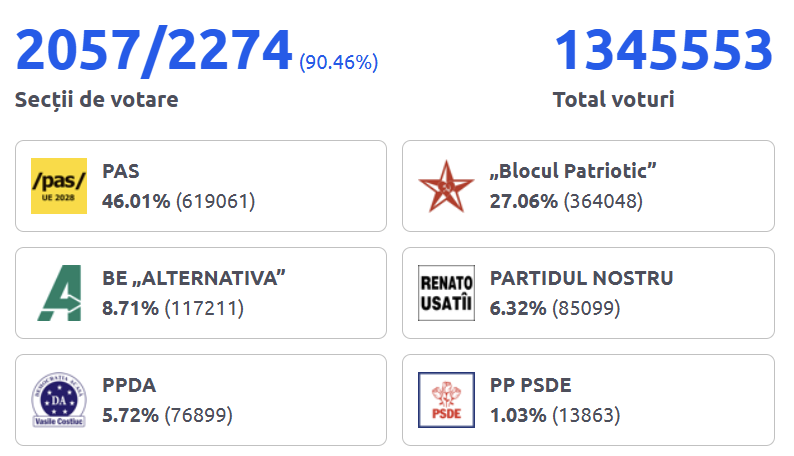 Rezultatele preliminare arată o victorie clară a PAS, cu un scor aproape dublu față de Blocul Patriotic, ceea ce confirmă orientarea pro-europeană a electoratului.
