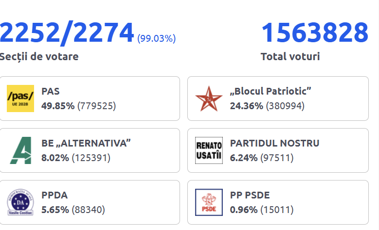 REZULTATE ALEGERI MOLDOVA 2025, după 99% din secţii, dintre care peste 93% din Diaspora: