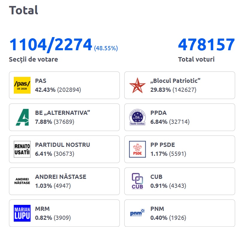 REZULTATE ALEGERI MOLDOVA 2025, după 48.55% din secţii, dintre care doar 5% din Diaspora: