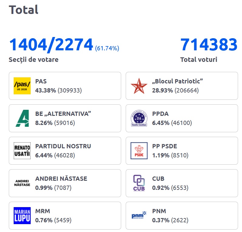 REZULTATE ALEGERI MOLDOVA 2025, după 61,74% din secţii