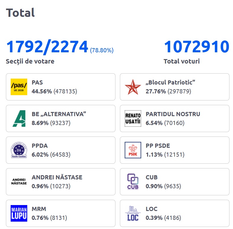 REZULTATE ALEGERI MOLDOVA 2025, după 78,80% din secţii