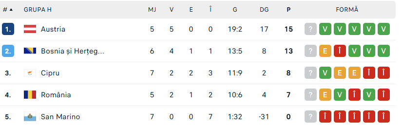 În Grupa H, Bosnia-Herțegovina ocupă primul loc, cu 12 puncte (5 jocuri), urmată de Austria, 12 puncte (4 jocuri), România, 7 puncte (5 jocuri), Cipru, 4 puncte (5 jocuri), San Marino, 0 puncte (5 jocuri).