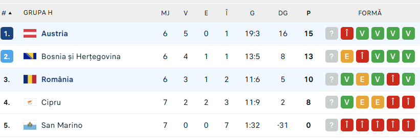 România – Austria s-a terminat 1-0. Tricolorii au revenit pe locul al treilea în grupa H, cu 10 puncte, Austria conduce, cu 15 puncte, iar Bosnia e a doua, cu 13 puncte.