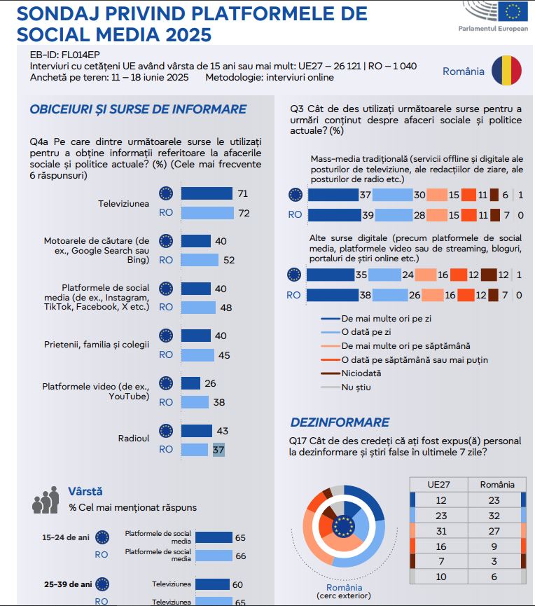 Peste trei sferturi (76%) dintre cetățenii români participanți la sondaj își iau informațiile de pe Facebook. Prin comparație, media UE la acespt capitol este de 58%. Folosesc Youtube pentru a se informa 66% dintre intervievați și aproape jumătate utilizează în acest scop platforma TikTok.