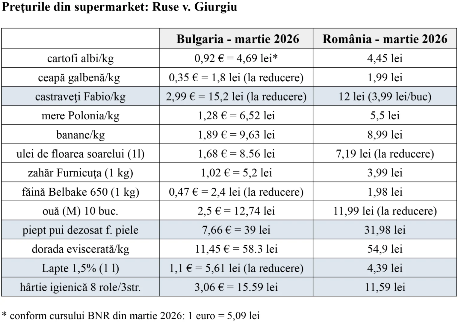 Situația este similară și în supermarketuri, unde majoritatea produselor comparate, zahăr, făină, lapte sau hârtie igienică, au prețuri mai mari în Bulgaria, chiar și la promoție. De exemplu, același bax de hârtie igienică este cu circa 26% mai scump decât în România.