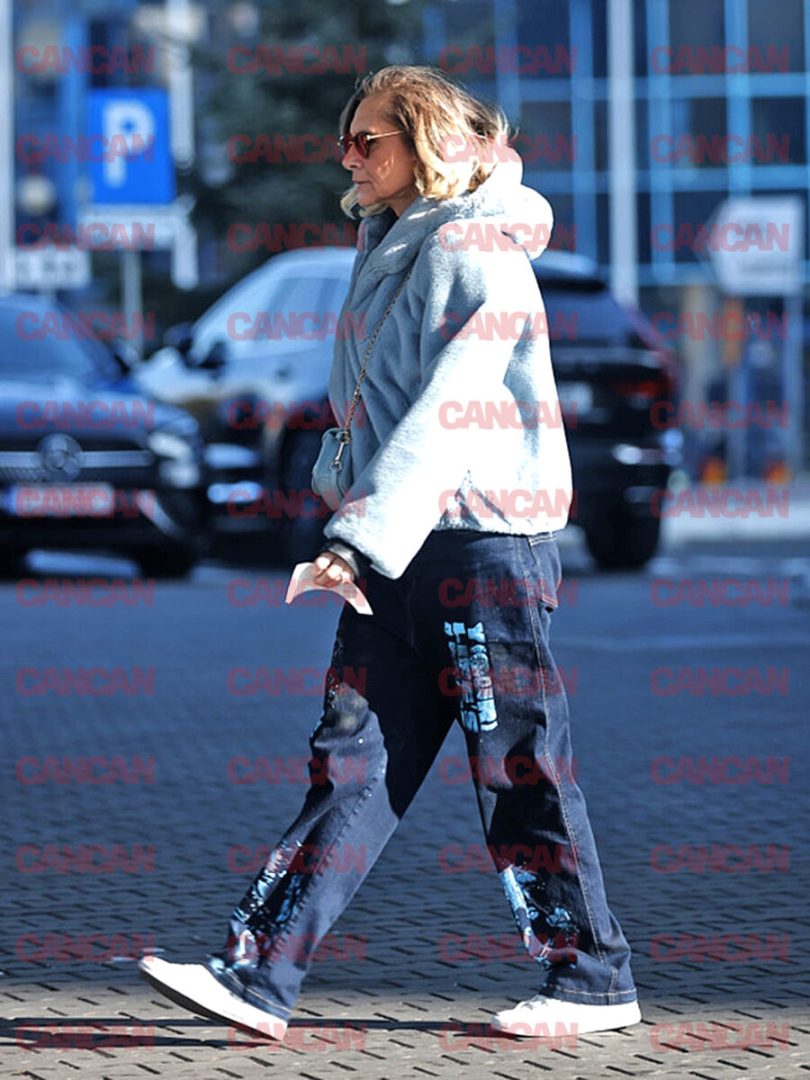 Vedeta a optat pentru o ținută simplă, dar la modă. Romanița Iovan a purtat o pereche de blugi largi, teniși albi și o jachetă de blană, semn că era pe grabă, iar confortul era mult mai important pentru ea în acele clipe.