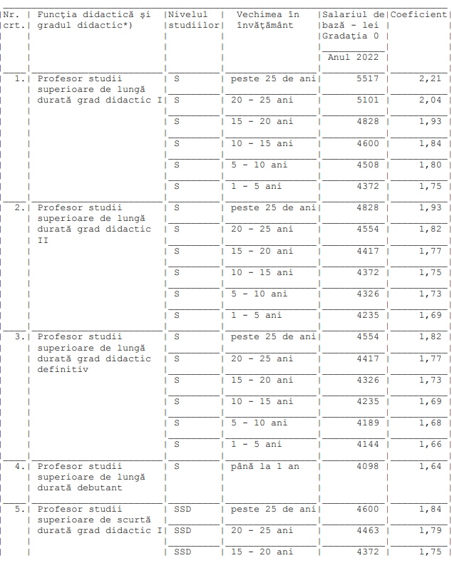 Profesorii cu grad didactic II și studii superioare de lungă durată cu vechime de 1-5 ani vor avea un salariu de bază de 4.235 de lei. Cei cu același grad și vechime de 5-10 ani, 4.326 de lei. Pentru vechime 10-15 ani, 4372 lei, pentru vechime 15-20 de ani, salariul de bază va fi 4.417 lei.