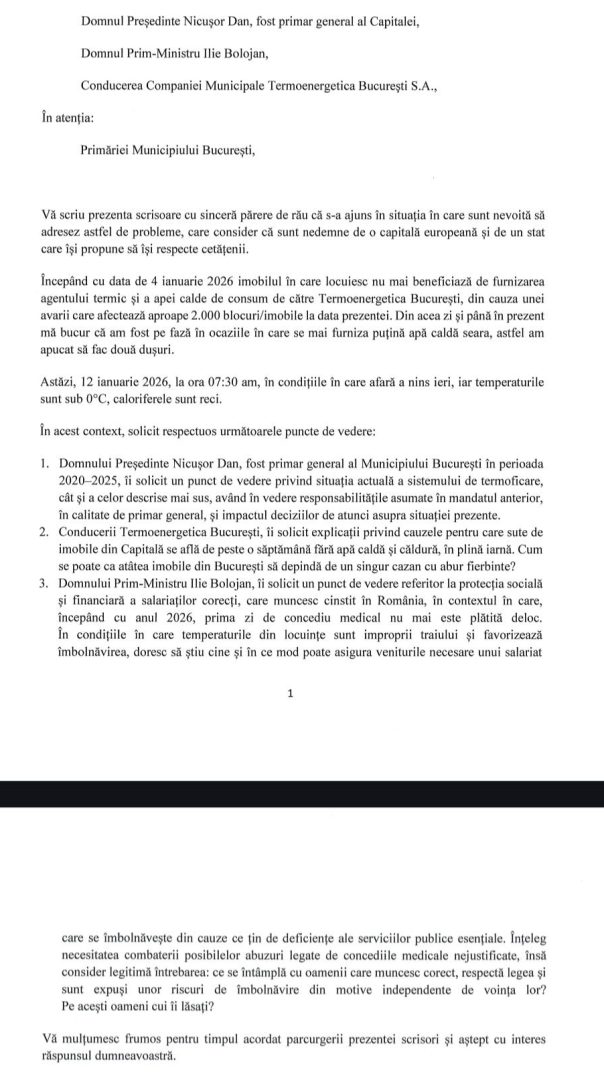 „Începând din 4 ianuarie 2026, imobilul în care locuiesc nu mai beneficiază de furnizarea agentilului termic și a apaei calde de consum de către Termoenergetica București din cauza unei avarii care afectează aproape 2.00 de blocuri/imobile la data prezentei. Din acea zi și până în prezent mă bucur că am fost pe fază în ocaziile ăn care se mai furniza puțină apă caldă, astfel am apucat să fac două dușuri. Astăzi, 12 ianuarie 2026, caloriferele sunt reci”, a scris femeia, care a publicat scrisoarea şi în comunitatea Cetățean Sector 3.