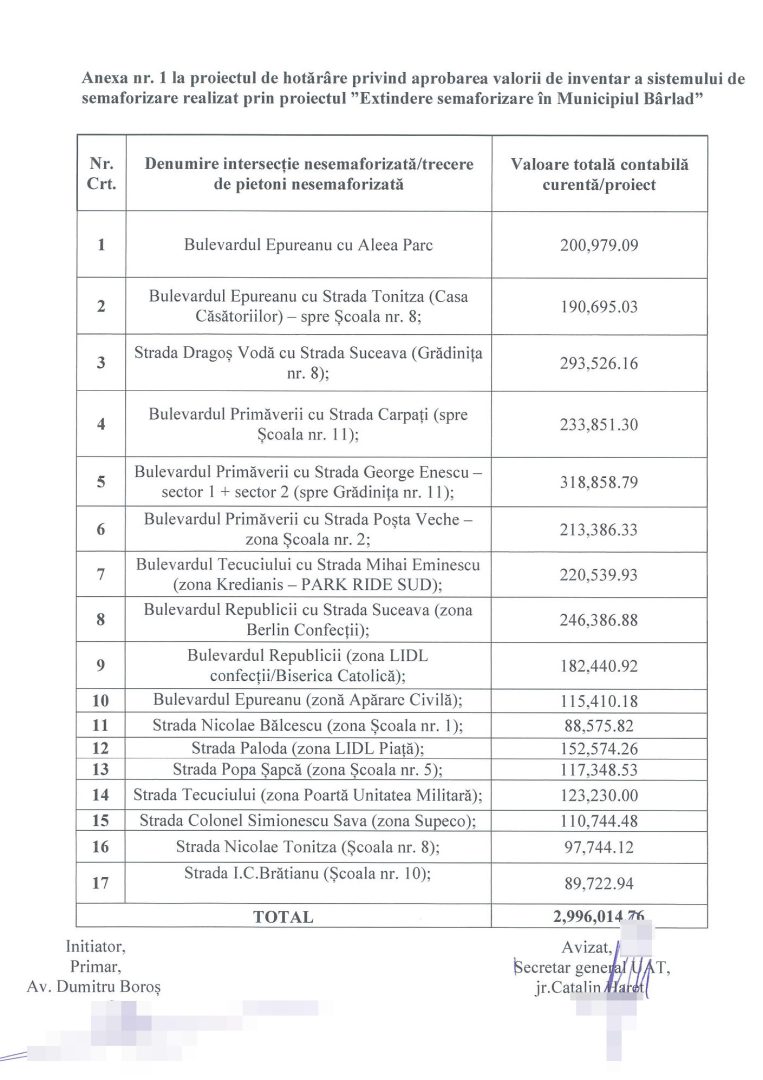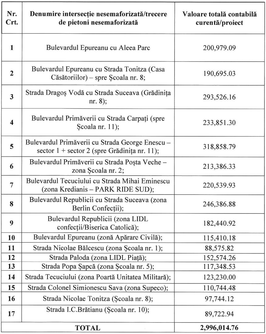 Un alt exemplu, Nicolae Bălcescu, Zona Școlii nr. 1, avem un galben intermitent pentru trecere de pietoni făcut cu 88 de mii! Avem Dragoș Vodă cu strada Suceava, o intersecție relativ mică, 293 de mii lei. Bulevardul Republicii cu strada Suceava, în zona Berlin avem un semafor care ajută la trecerea de pietoni, 246 486 lei.