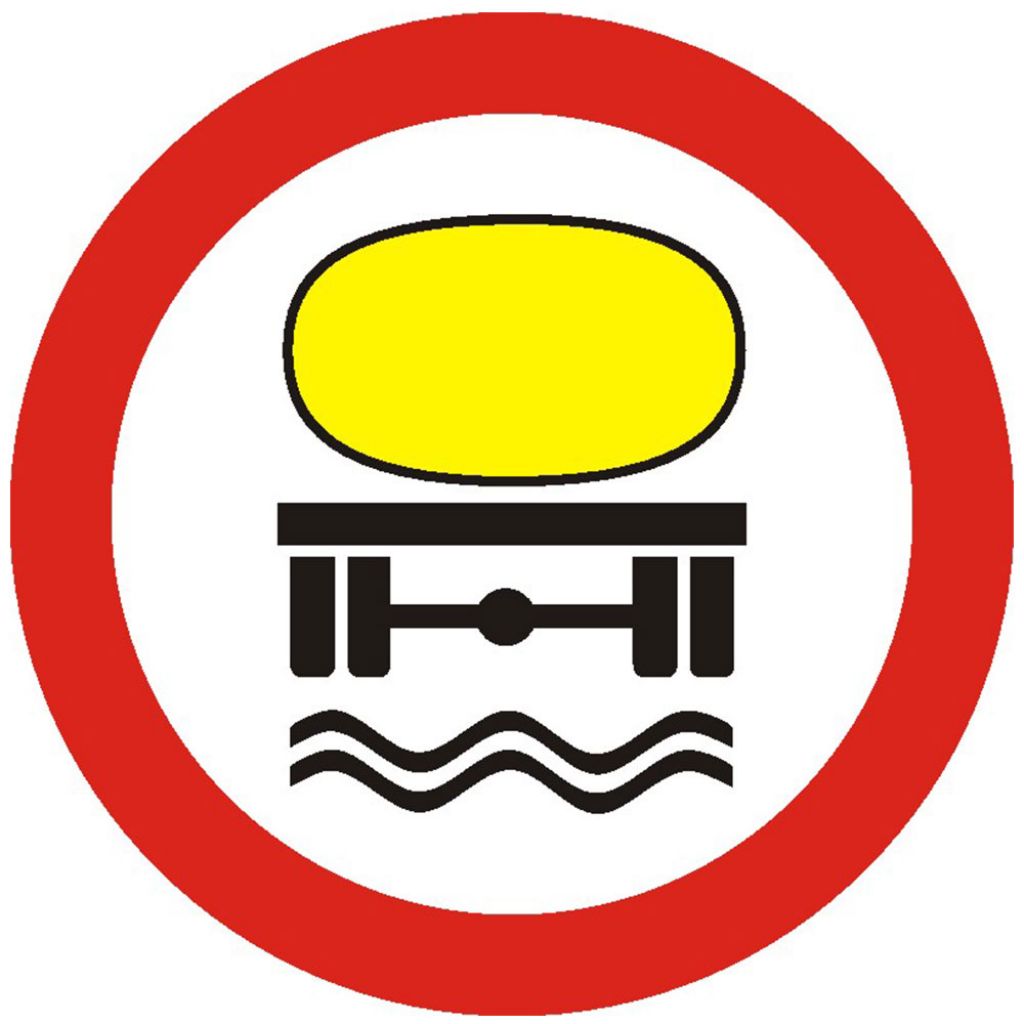 Acest semn rutier există încă din anul 1988, dar le dă bătăi de cap multor șoferi. Panoul semnalizează faptul că există un pericol, fiind de culoare roșie de jur-împrejur. În această imagine apare o cisternă, iar sub ea sunt desenate două linii ondulate albastre, simbolizând apa.