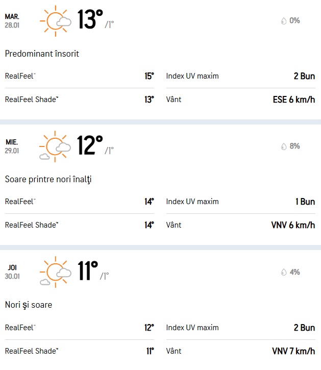 Pentru marți, 28 ianuarie, se anunță 13 grade Celsius în Poiană! Miercuri, 29 ianuarie, ar urma să fie 12 grade, iar pentru joi, 30 ianuarie, se anunță 11 grade, potrivit Accuweather.